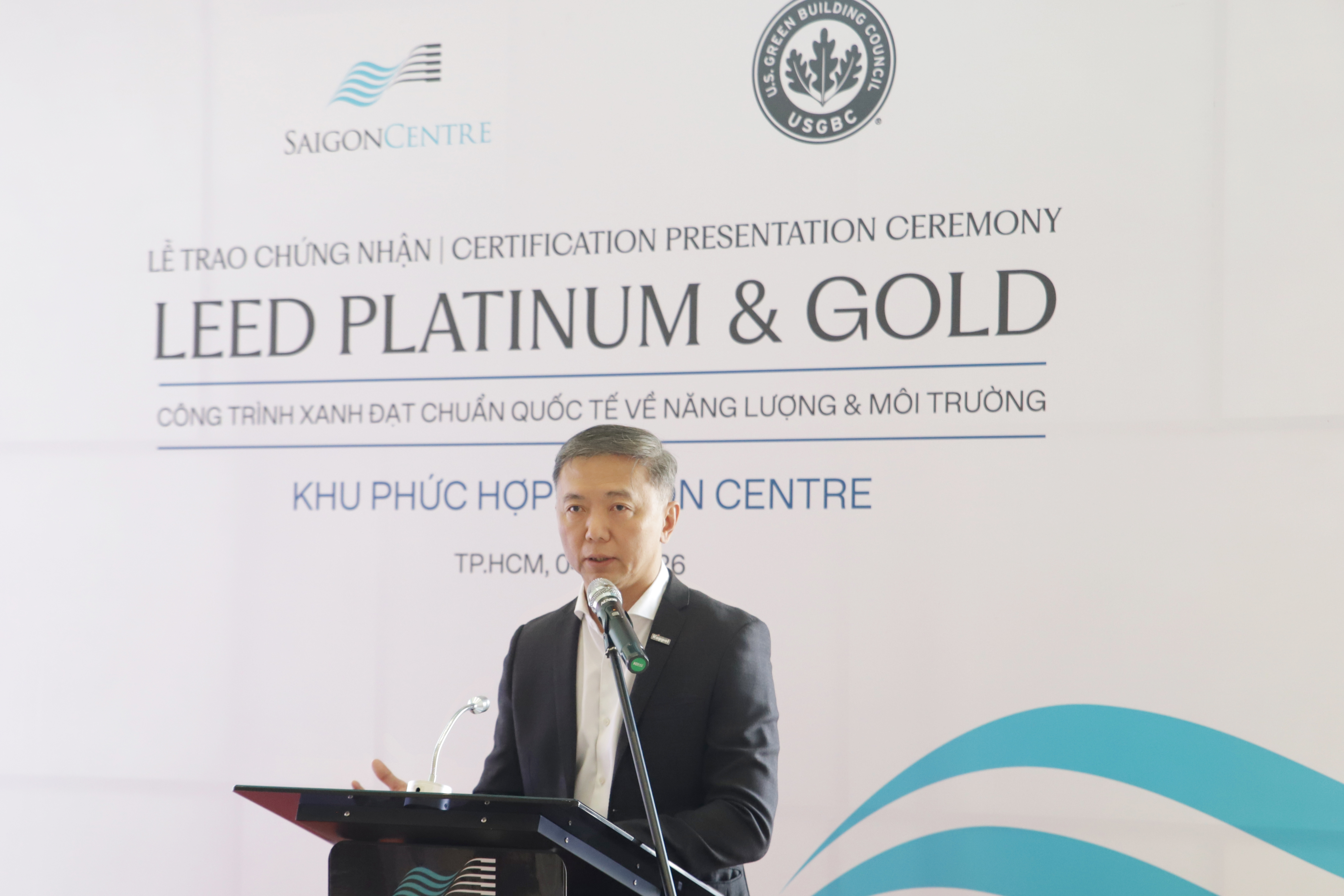 Lễ trao chứng nhận LEED được tổ chức tại Saigon Centre với sự góp mặt của Ông Gopalakrishnan, Giám đốc Điều hành Hội đồng Công trình Xanh Hoa Kỳ, khu vực Nam Á và Trung Đông, Ông Santanu Duttagupta, Giám đốc Phát triển Thị trường Hội đồng Công trình Xanh Hoa Kỳ tại Đông Ấn Độ, Bangladesh và Việt Nam; Ông Đỗ Hữu Nhật Quang, Giám đốc kinh doanh GreenViet – đơn vị tư vấn LEED cho dự án Saigon Centre; cùng ông Lim Kay Siong, Trưởng bộ phận Quản lý Tài sản, Khối Bất động sản, Keppel Việt Nam, kiêm Tổng Giám đốc tòa nhà Saigon Centre và Bà Sharon Ong, Trưởng Bộ phận Quản Lý và Điều Hành khối TTTM Saigon Centre.
