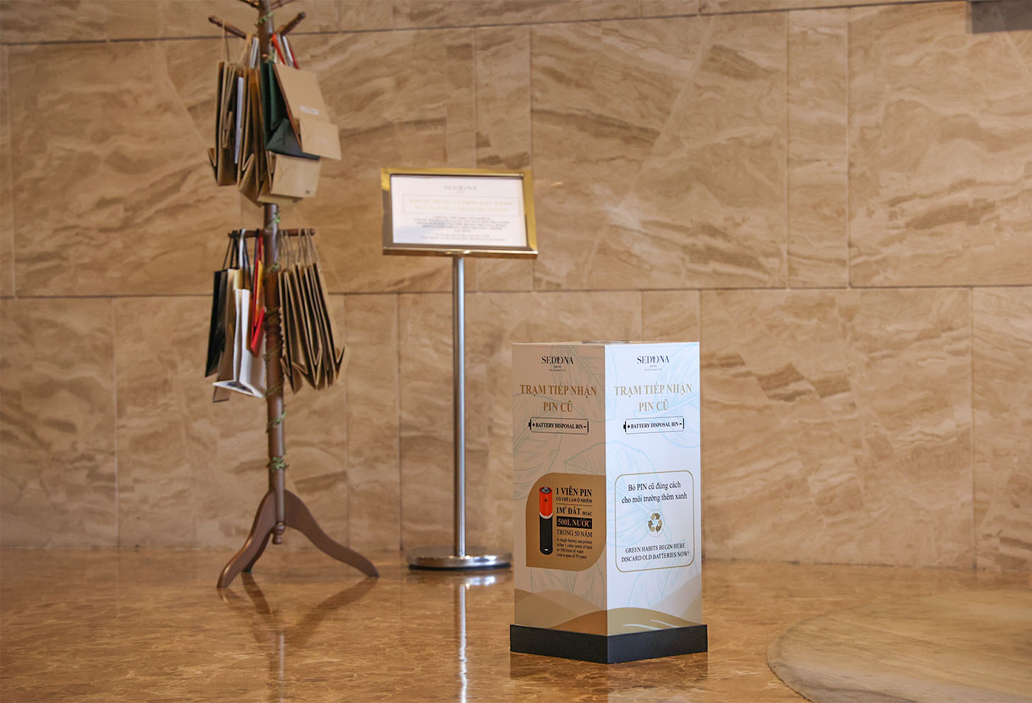 Cây treo túi và trạm tiếp nhận pin cũ đặt tại Sedona Suites.